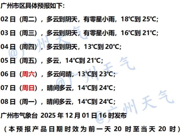 预计12月2日夜间到12月3日,有中等偏弱冷空气影响广东,未来三天广东大部阴天到多云,伴弱降水昼夜温差减小,气温小幅下降。