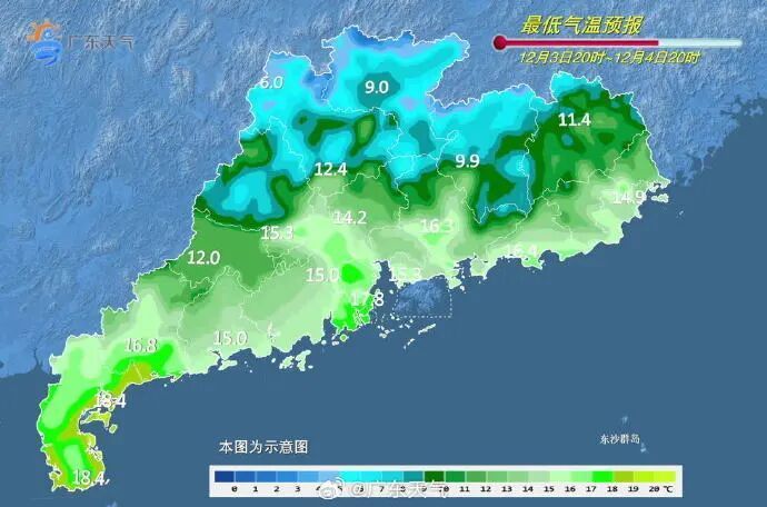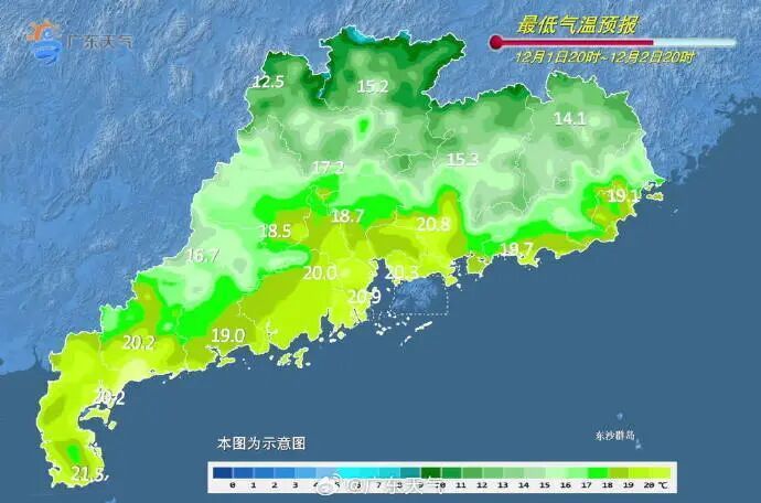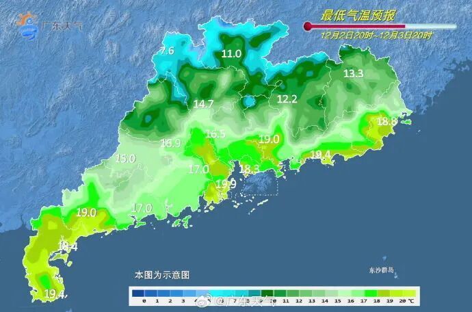 广东省气象台预计,12月2日,广东大部阴天到多云,部分市县有小雨。12月3日—4日受中等偏弱冷空气南下影响,广东气温小幅下降,中北部市县日平均气温下降4~6℃,其余市县气温下降3~4℃。